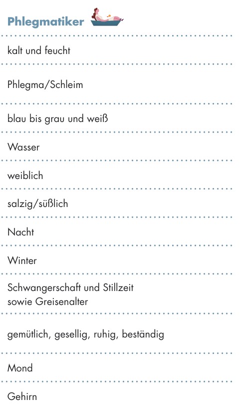 In der Traditionellen Europäischen Medizin steht der Phlegmatiker für das nährende Prinzip. Phlegma, die feuchte, kühlende Qualität ist jene Substanz, die nährt und schützt. Sie findet sich bildlich im Bindegewebe, im Fett, im Knochenmark und im Gehirn.